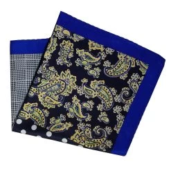 100% Silk Pocket Square Navy Blue Polka Dots With Yellow Paisleys 12.5in