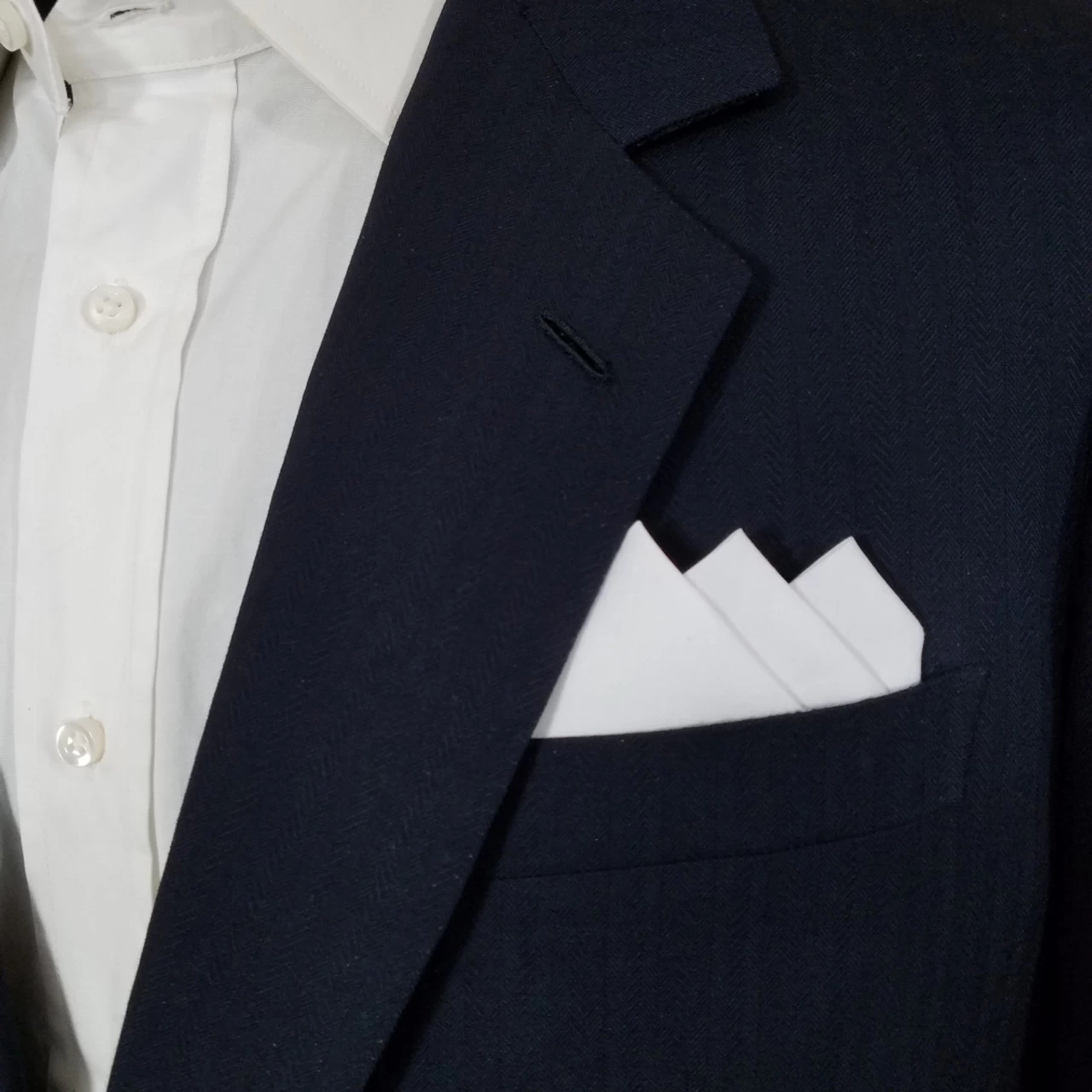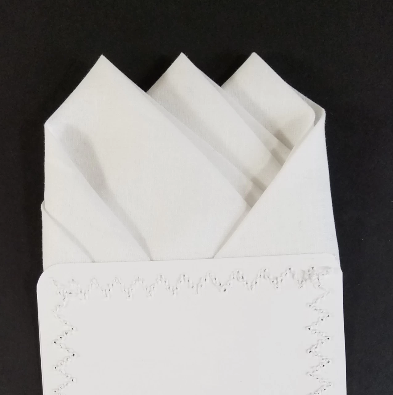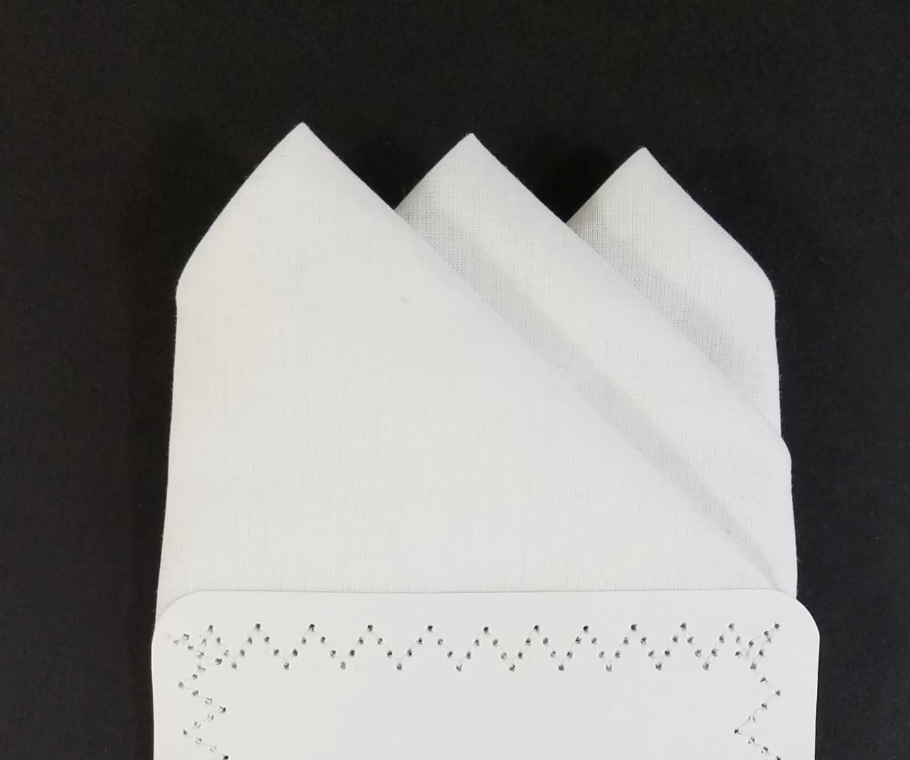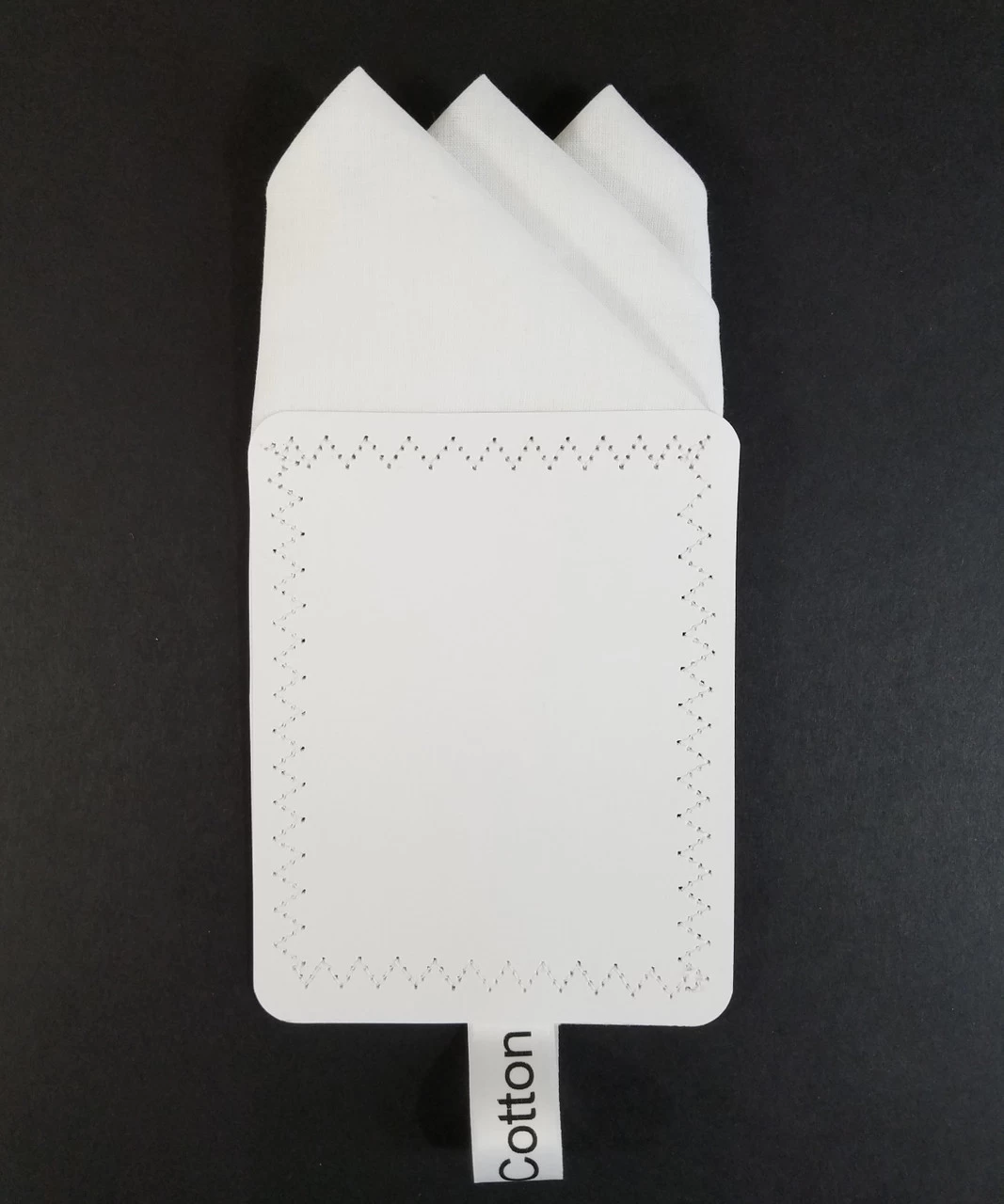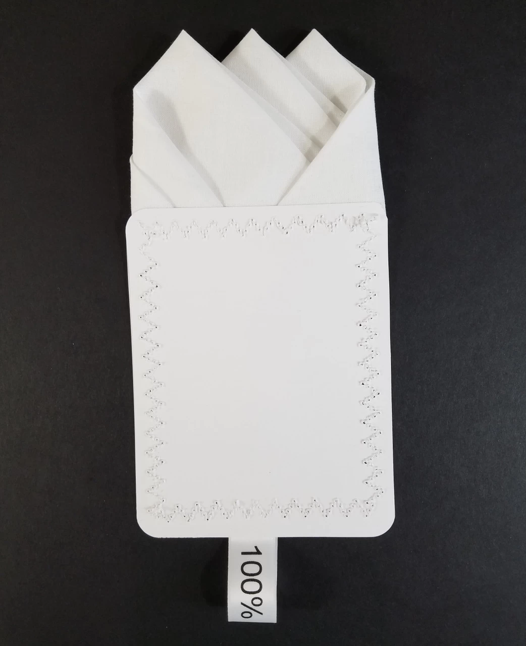 Dress up your suit or sport coat with a pre-folded pocket square. It’s easy to use and looks like a well placed pocket square. Just slip the insert into your breast pocket and adjust height to your taste. Trim bottom of card if you want less pocket square showing.